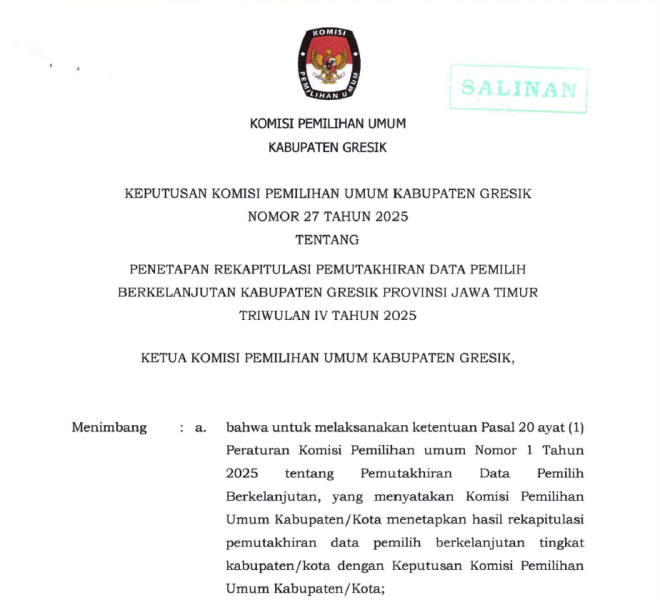 KEPUTUSAN KOMISI PEMILIHAN UMUM KABUPATEN GRESIK NOMOR 27 TAHUN 2025 TENTANG PENETAPAN REKAPITULASI PEMUTAKHIRAN DATA PEMILIH BERKELANJUTAN KABUPATEN GRESIK PROVINSI JAWA TIMUR TRIWULAN IV TAHUN 2025