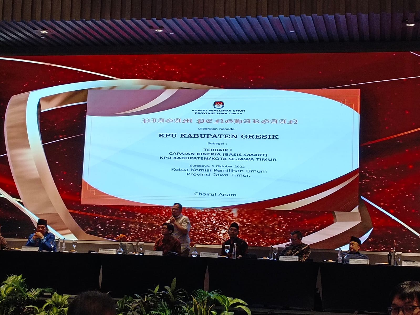 Kategori Capaian Kinerja Bebasis Sistem Monitoring dan Evaluasi Kinerja Terpadu Kementrian Keuangan (SMART). Terbaik I diraih oleh KPU Gresik. Terbaik II KPU Kota Madiun. Terbaik III KPU Kota Blitar. Penghargaan langsung diterima oleh ketua KPU Gresik Akhmad Roni.
