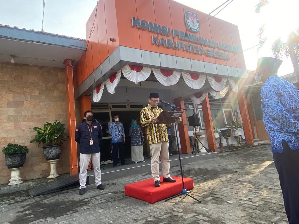 Bertindak sebagai Inspektur Upacara, Ketua KPU Gresik Achmad Roni membacakan naskah Sambutan Ketua KPU RI. Turut hadir mengikuti upacara secara khidmat, Anggota KPU Gresik, Sekretaris Ahmad Fahruddin juga hadir beserta seluruh pejabat struktural, fungsional, dan staf di Lingkungan Sekretariat KPU Gresik.