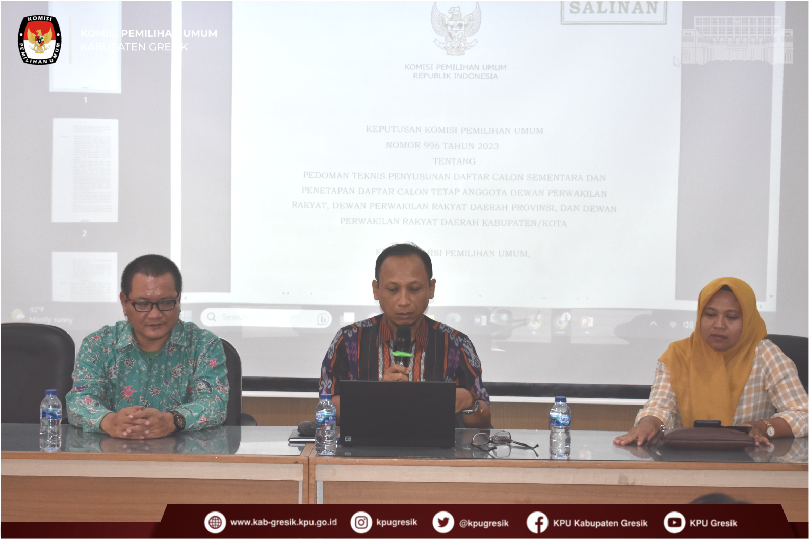 Minggu, 6 Agustus 2023 KPU Kabupaten Gresik sampaikan hasil Verifikasi Administrasi Dokumen Persyaratan Bakal Calon Anggota DPRD Kabupaten Gresik kepada 18 Partai Politik peserta pemilu 2024. Penyampaian hasil vermin ini dilakukan di Kantor KPU Kabupaten Gresik, Jl. Dr. Wahidin Sudirohusodo No. 690 Kebomas Gresik. Tidak hanya menyampaikan hasil Verifikasi Administrasi Dokumen Persyaratan Bakal Calon Anggota DPRD Kabupaten Gresk, KPU Kabupaten juga melakukan sosialisasi mengenai Keputusan KPU No. 996 Tahun 2023 tentang Teknis Penyusunan Daftar Calon Sementara (DCS) dan Penetapan Daftar Calon Tetap (DPT) Anggota DPRD Kabupaten/Kota. Ketua KPU Kabupaten Gresik Akhmad Roni menyampaikan bahwa pencermatan rancangan DCS dimulai pada hari minggu, 6 Agustus 2023 hingga jumat, 11 Agustus 2023. “ Sesuai dengan program dan jadwal tahapan, setelah ini akan dilakukan pencermatan rancangan DCS yang dimulai dari hari ini hingga hari jumat mendatang.” Ungkap Roni Roni juga menyampaikan kepada seluruh partai politik peserta pemilu yang menyerahkan dokumen bacalegnya untuk benar-benar mencermati kembali dokumen yang masih belum memenuhi syarat. “ Pada masa pencermatan rancangan DCS yang akan berjalan mulai tanggal 6 Agustus 2023 hinggal 11 Agustus 2023 ini saya tekankan kepada seluruh partai politik yang mencalonkan anggotanya agar dapat memperbaiki dokumen bacaleg yang masih belum memenuhi syarat. “ jelasnya Terakhir, Roni menegaskan kepada partai politik agar benar-benar mencermati kembali dokumen bakal calon yang akan dikirimkan melalui Silon sebelum penetapan DCT, karena setelah penetapan DCT tidak ada kesempatan lagi bagi bakal calon untuk memperbaiki dokumennya kembali. “ Saya benar-benar tekankan kepada seluruh partai politik yang hadir sekarang ini agar benar-benar mencermati kembali dokumen yang akan diinput ke silon sebelum penetapan DCT tanggal 3 November 2023. Saya harap semua dokumen yang telah dikirim ke silon sudah sesuai dengan ketentuan yang harus dipenuhi.” Pungkas Roni. Turut Hadir Anggota Badan Pengawas Pemilu Kabupaten Gresik, Rofa’atul Hidayah.