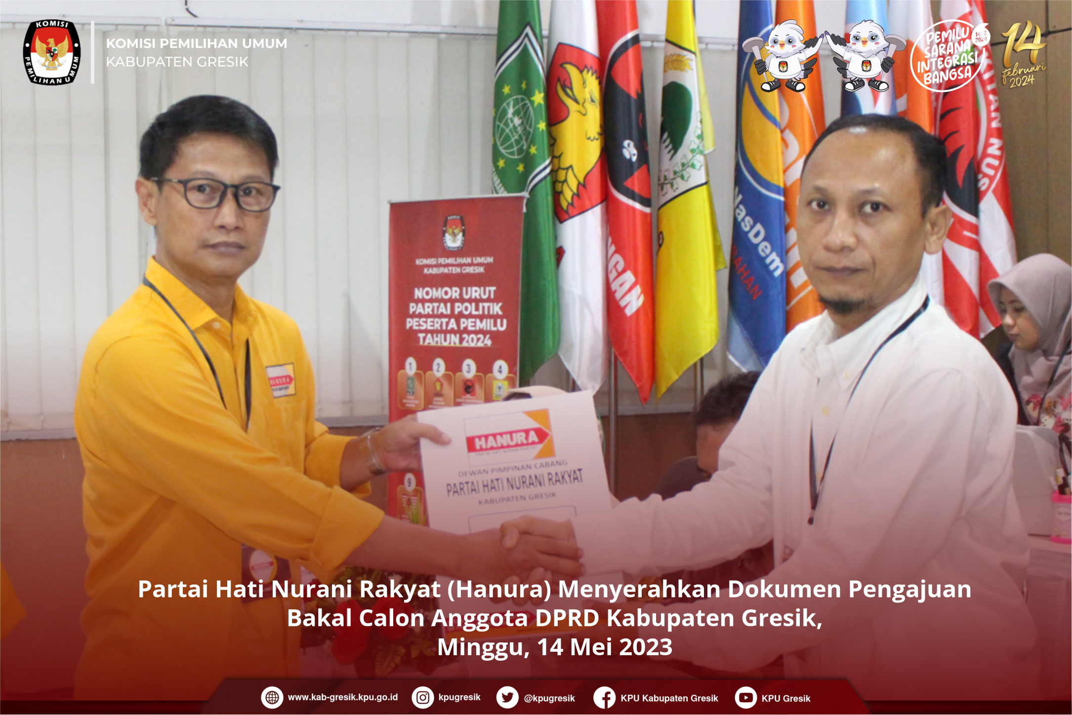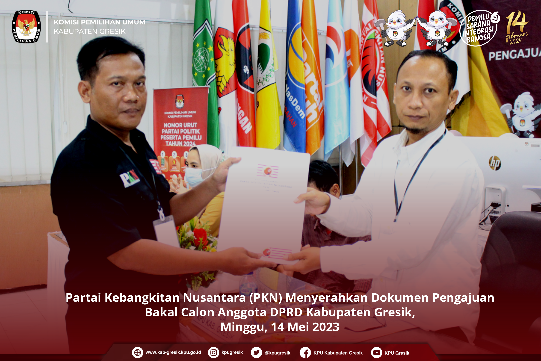 Partai Kebangkitan Nusantara mengajukan bakal calegnya ke Kantor KPU Kabupaten Gresik bersama beberapa anggota yang ikut serta mengiringi pada tanggal 14 Mei 2023 pukul 19.06 WIB Kedatangan anggota Partai Kebangkitan Nusantara tersebut disambut oleh Komisioner beserta Sekretaris KPU Gresik. Dalam kesempatan ini KPU Kabupaten Gresik memberi kesempatan bagi Pimpinan Cabang untuk memberi sambutan. Dalam sambutannya Pimpinan Cabang Parta Kebangkitan Nusantara, Moh. Zahrul Meminta arahan kepada KPU Kabupaten Gresik apabila ada kesalahan pada berkas yang diserahkan. “ Terima kasih kepada KPU Kabupaten Gresik yang telah menyambut dan menerima kami dengan baik dengan segala kekurangan kami. Kami berharap penyerahan dokumen pengajuan kami dapat diterima dengan baik juga dan kami meminta arahan kepada KPU Kabupaten Gresik apabila ditemukan kesalahan dalam berkas yang kami ajukan “ jelas Moh. Zahrul. Setelah penyerahan dokumen, pemeriksaan dilakukan oleh Komisioner serta Admin Silon KPU Kabupaten Gresik. Dari hasil pemeriksaan tersebut, Akhmad Roni menyatakan bahwa dokumen yang diajukan oleh Partai Kebangkitan Nusantara dinyatakan diterima. “ Seluruh dokumen yang diserahkan sudah kami cermati dan kami verifikasi. Bacaleg yang dicalonkan tidak lebih dari 100%, keterwakilan perempuan juga sudah kami cek, dan semua persyaratan yang harus dilengkapi sudah kami cek. Dokumen yang dokumen yang diperlukan sesuai dengan PKPU Nomor 10 Tahun 2023 kami nyatakan dokumen Partai Kebangkitan Nusantara diterima “ Jelas Akhmad Roni.