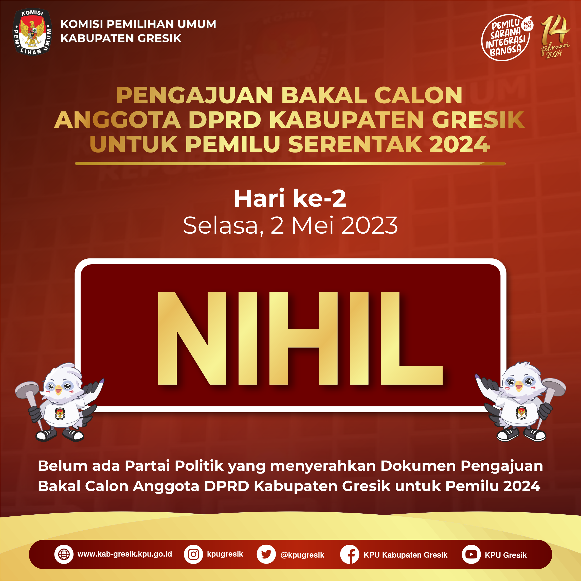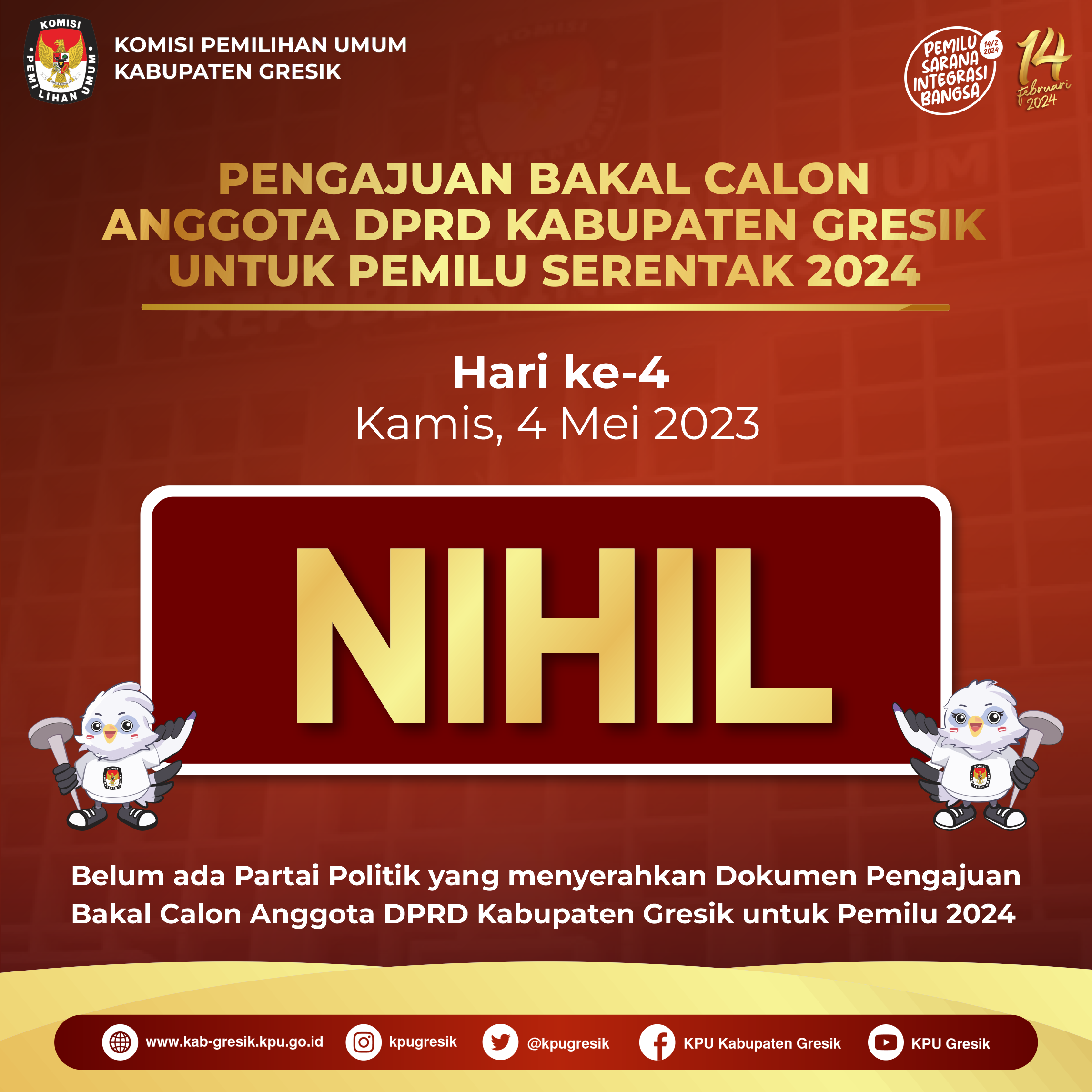 Hari ke-4 pengajuan bakal calon anggota DPRD Kabupaten Gresik untuk Pemilu 2024 telah berlalu, namun hingga saat ini belum ada dokumen pengajuan bakal calon yang diterima oleh KPU Kabupaten Gresik. Sekretaris KPU Kabupaten Gresik Ahmad Fahruddin menegaskan bahwa hingga saat ini memang belum ada partai politik yang menyerahkan dokumen pengajuan bakal calon anggota DPRD Kabupaten Gresik. “Hingga saat ini belum ada partai politik yang belum menyerahkan dokumen pengajuan bakal calon anggota DPRD Kabupaten Gresik, mungkin parpol akan mengajukan bacalegnya pada minggu kedua dari waktu pengajuan bakal calon DPRD Kabupaten Gresik, karena untuk melengkapi dokumen persyaratan pencalonan juga butuh waktu” tuturnya. Kendati demikian KPU Kabupaten Gresik siap menerima dokumen pengajuan bakal calon angota DPRD Kabupaten Gresik untuk pemilu 2024 sesuai peraturan perundang-undangan yang berlaku, yakni mulai tanggal 1 s/d 14 Mei 2023. “Sering kami sampaikan bahwa kami selalu siap menerima dokumen pengajuan bakal calon DPRD Kabupaten Gresik untuk Pemilu 2024 mulai tanggal 1 sampai 14 Mei 2023 pukul 08.00 WIB hingga 16.00 WIB, sedangkan untuk tanggal 14 kita siap melayani mulai pukul 08.00 WIB hingga 23.59 WIB” Jelas Ahmad Fahruddin. (kpugresik/agung)