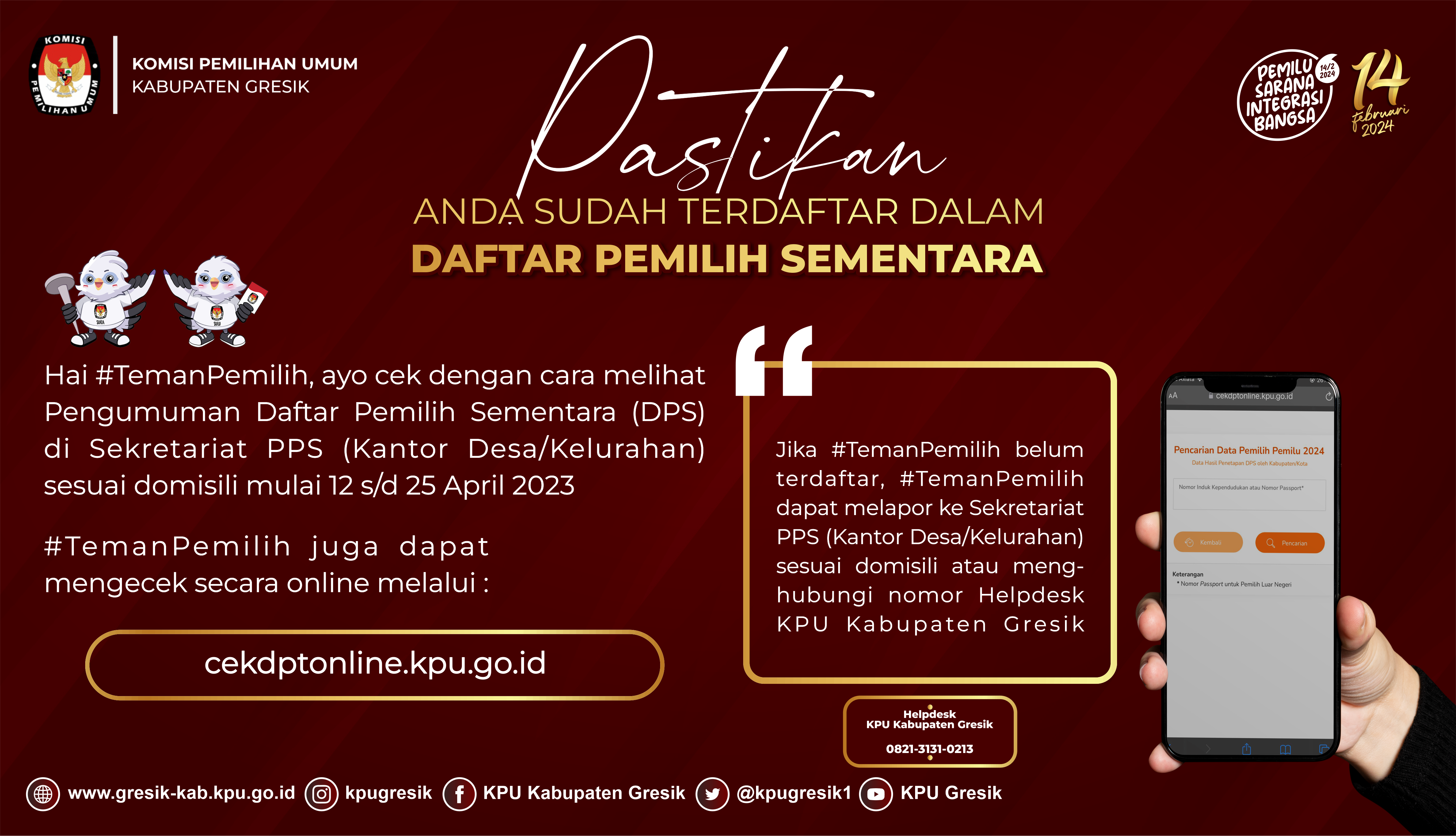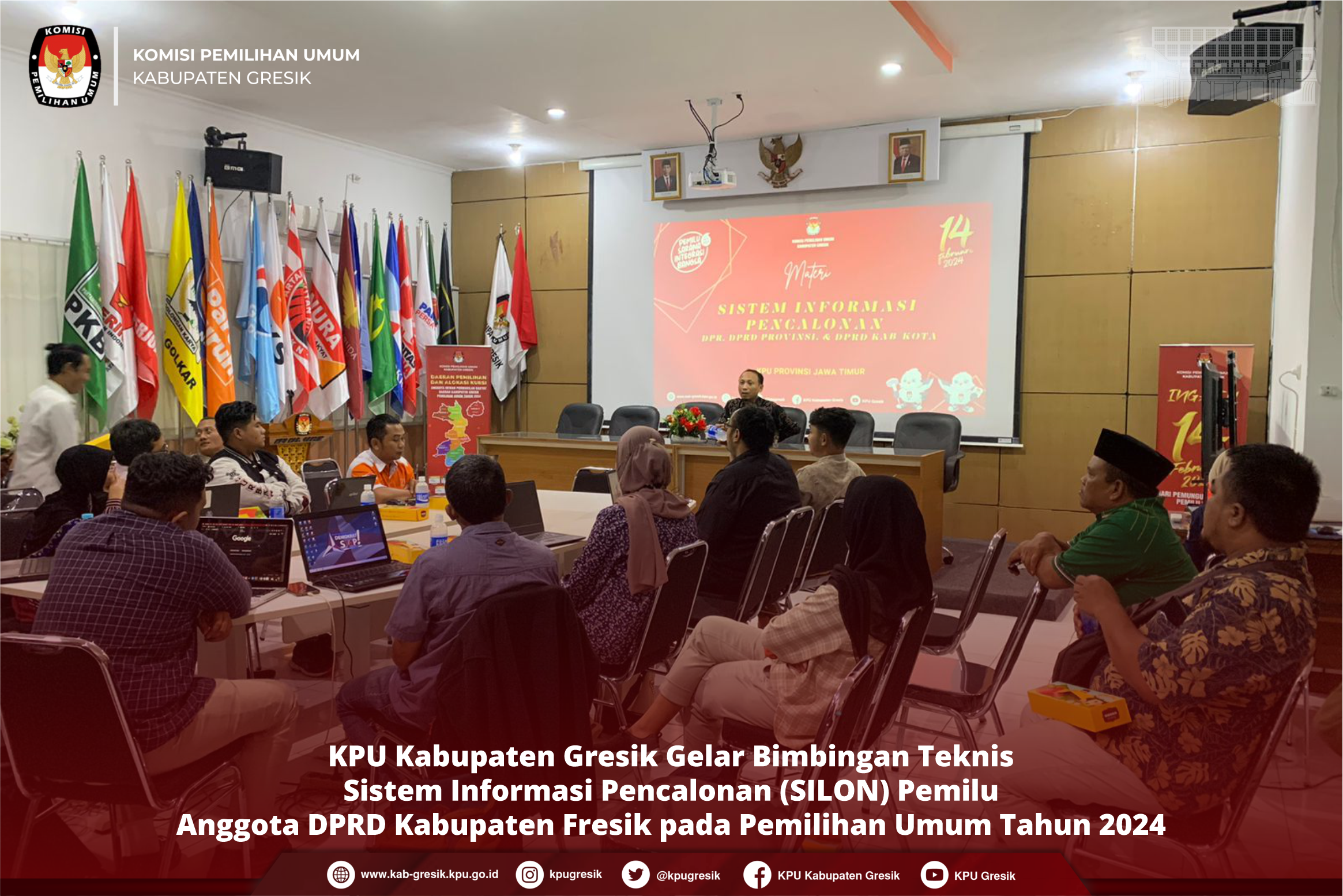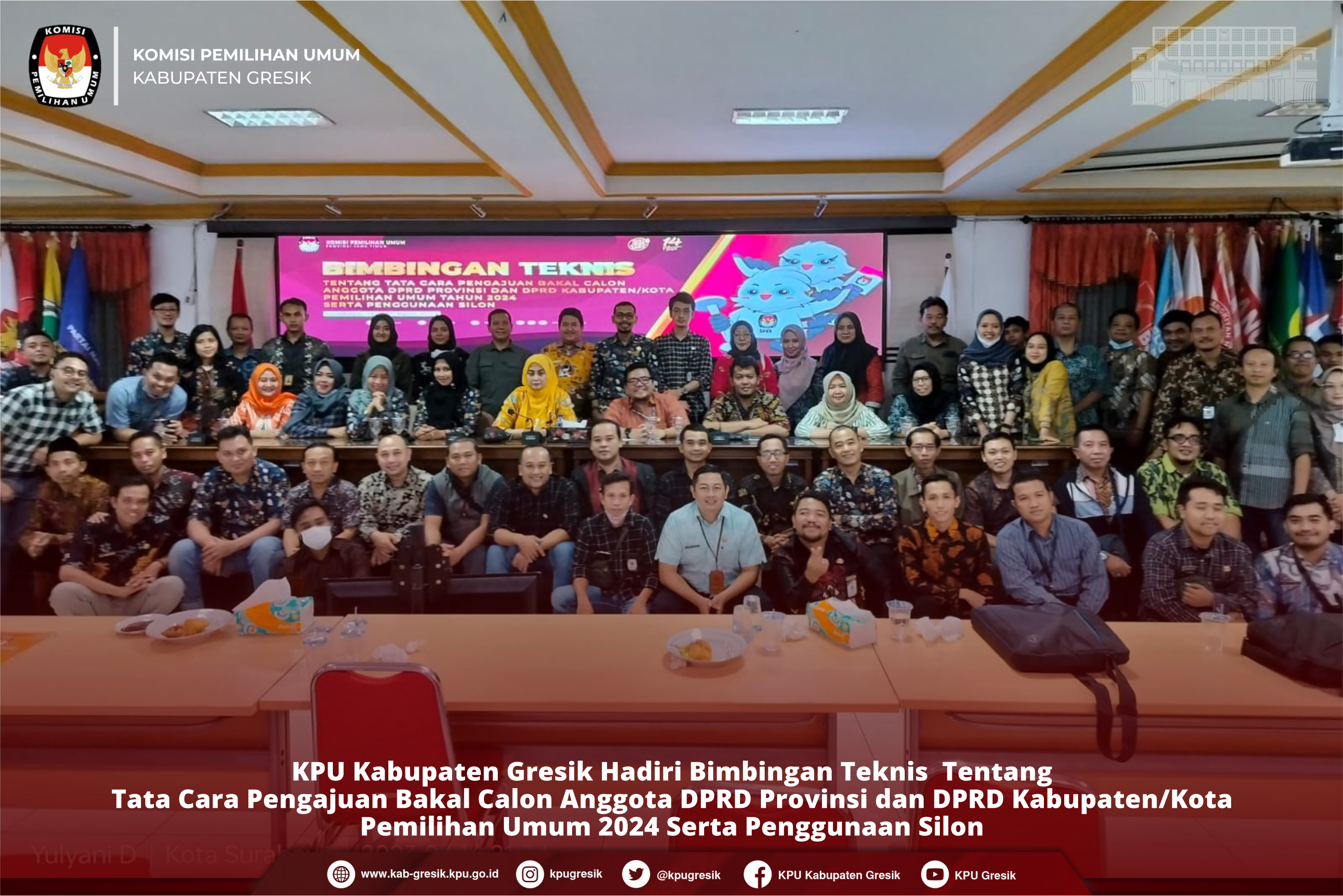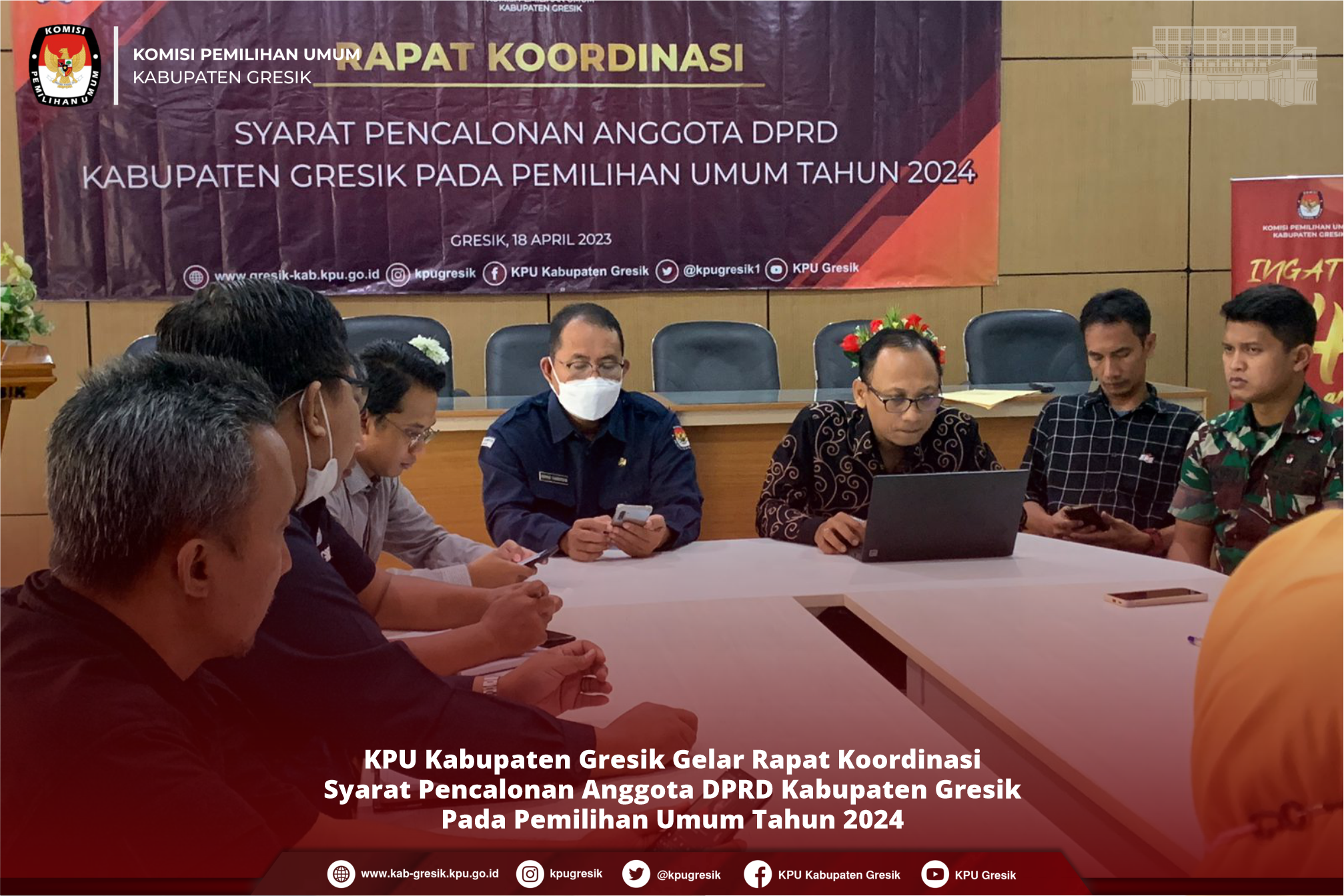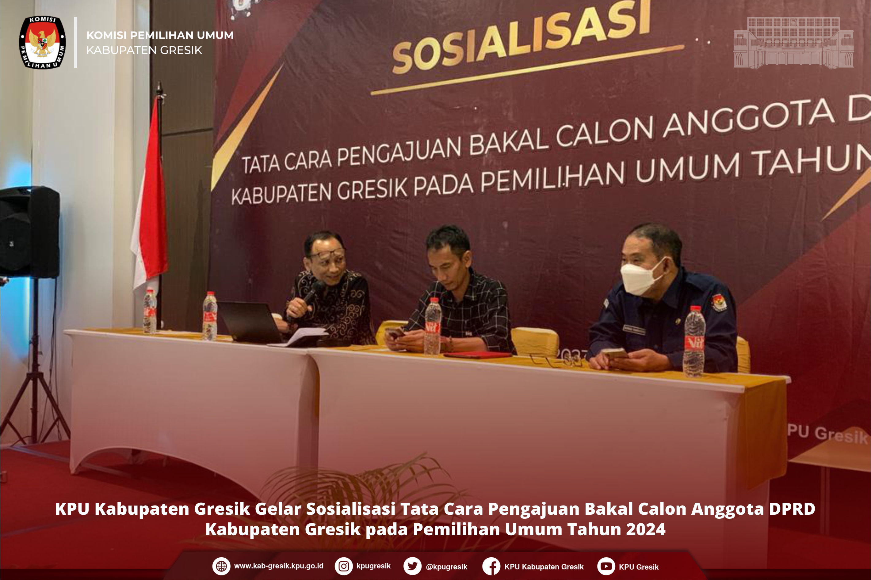 KPU Kabupaten Gresik Melaksanakan Sosialisasi Tata Cara Pengajuan Bakal Calon Anggota DPRD Kabupaten Gresik di Hotel Santika Gresik, pada Selasa (18/4/2023). Acara yang dimulai pada pukul 15.00 WIB itu dibuka oleh Anggota KPU Kabupaten Gresik Abd. Sidiq Notonegoro dalam sambutannya beliau menyampaikan kegiatan ini merupakan awal sosialisasi pada tahap pencalonan anggota DPRD Kabupaten Gresik dan beliau berharap agar pada Pemilu serentak tahun 2024 nanti dapat melahirkan calon-calon pemimpin bangsa yang terbaik. “Sosialisasi ini merupakan tahap awal bagi bakal calon untuk mempersiapkan dokumen persyaratan pengajuan bakal calon anggota DPRD Kabupaten Gresik. Saya harap sosialisasi ini dapat memberikan pencerahan bagi bakal calon terkait kejelasan dokumen yang harus diserahkan.“ terangnya. Ketua KPU Kabupaten Gresik, Akhmad Roni menyampaikan tahapan penting dalam pencalonan anggota DPRD Kabupaten Gresik pada intinya meliputi 4 Tahapan yaitu a) Pengajuan Bakal Calon, b) Verifikasi Administrasi, c) Penyusunan Daftar Calon Sementara (DCS), d) Penetapan Daftar Calon Tetap (DCT). “Dalam tahapan pencalonan anggota DPRD Kabupaten Gresik, ada 4 inti dari tahapan tersebut yaitu Pengajuan Bakal Calon, Verifikasi Administrasi, Penyusunan Daftar Calon Sementara (DCS), dan Penetapan Daftar Calon Tetap (DCT)” tuturnya. Turut hadir Ketua KPU Kabupaten Gresik Akhmad Roni, Anggota KPU Kabupaten Gresik Abd. Sidiq Notonegoro dan Kholyatul Mudznibah, Sekretaris KPU Kabupaten Gresik Ahmad Faruddin beserta staf jajaran. Acara Sosialisasi ini diakhiri dengan buka bersama dengan seluruh anggota dan staff KPU Kabupaten Gresik serta seluruh peserta yang hadir.