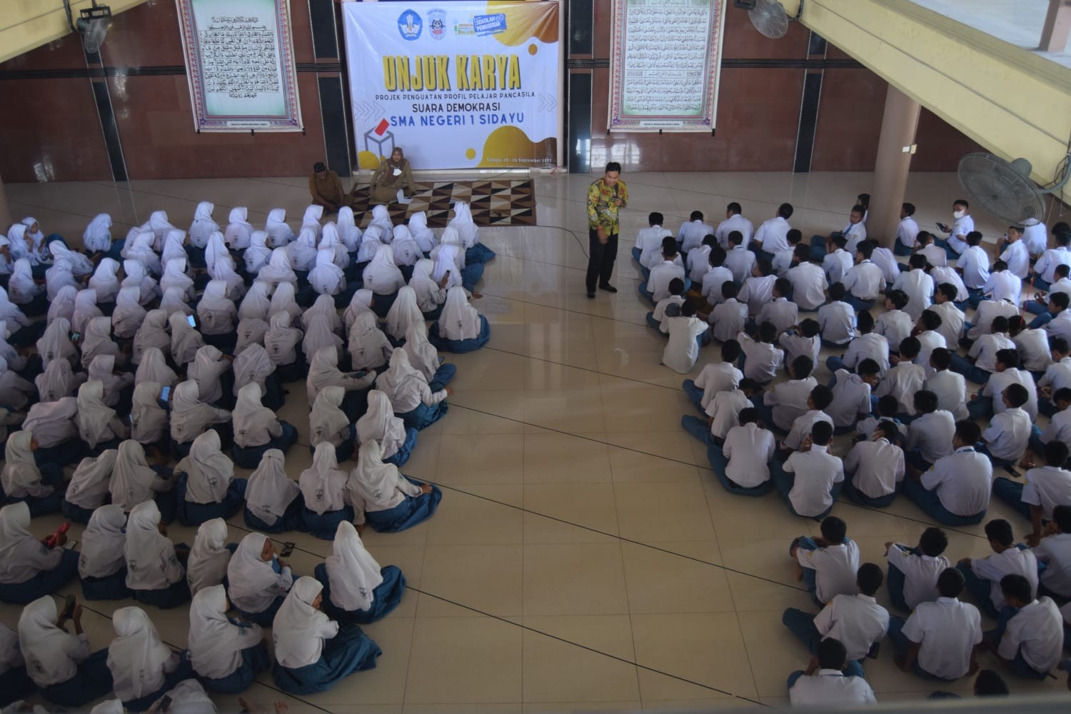 Komisi Pemilihan Umum Kabupaten Gresik mulai turun menyapa para pemilih pemula. Hari ini komisioner KPU Gresik divisi Sosialisasi dan SDM Makmun hadir di SMA Negeri 1 Sidayu, (27/08/2022). Dalam paparannya Makmun menyampaikan pentingnya peran pemilih Generasi Z dalam pemilihan Umum tahun 2024 nanti. Dimana populasi mereka terbesar yakni dua puluh tujuh persen (27%) atau setara dengan tujuh puluh empat juta orang di Indonesia. Dibawah generasi Z ada Generasi Milenial dengan populasi dua puluh lima persen (25%) atau enam puluh Sembilan juta orang. “sesungguhnya penentu pemimpin bangsa kita kedepan ini adalah generasi Z yakni mereka yang lahir di tahun 1981 sampai 1996” terang Makmun Ditempat yang sama komisioner dua periode ini menekankan supaya siswa dan siswi SMA Negeri 1 menjadi pemilih yang cerdas, tidak mimilih dengan pertimbangan pragmatise tetapi sebaliknya memilih karena pertimbangan yang rasional, diantaranya karena latar belakang yang bagus, pengalaman mengelola Negara yang baik dan lain sebagainya. “ditangan para pemilih digenerasi Z inilah nasib bangsa ini dipertaruhkan, jika siswa dan siswi para pemilih pemula ini cerdas dalam menentukan pilihan, kita optimis bangsa ini akan semakin baik, tegas Makmun. dalam sambutannya Abdul Manaf wakil kepala sekolah bidang kurikulum menyampaikan terima kasih kepada KPU Gresik yang berkenan berkunjung ke SMA Negeri 1 Sidayu. “terima kasih saya sampaikan kepada KPU Gresik yang berkenan memberikan sosialisasi terhadap anak didik kami, semoga ilmu yang didapat bermanfaat.” Terang Manaf. Acara berjalan anstusis sekali, meskipun peserta berjumlah 750 siswa dan siswi kegiatan berjalan kondusif. Acara diakhiri dengan Tanya jawab dan foto bersama (iga/kpugresik)