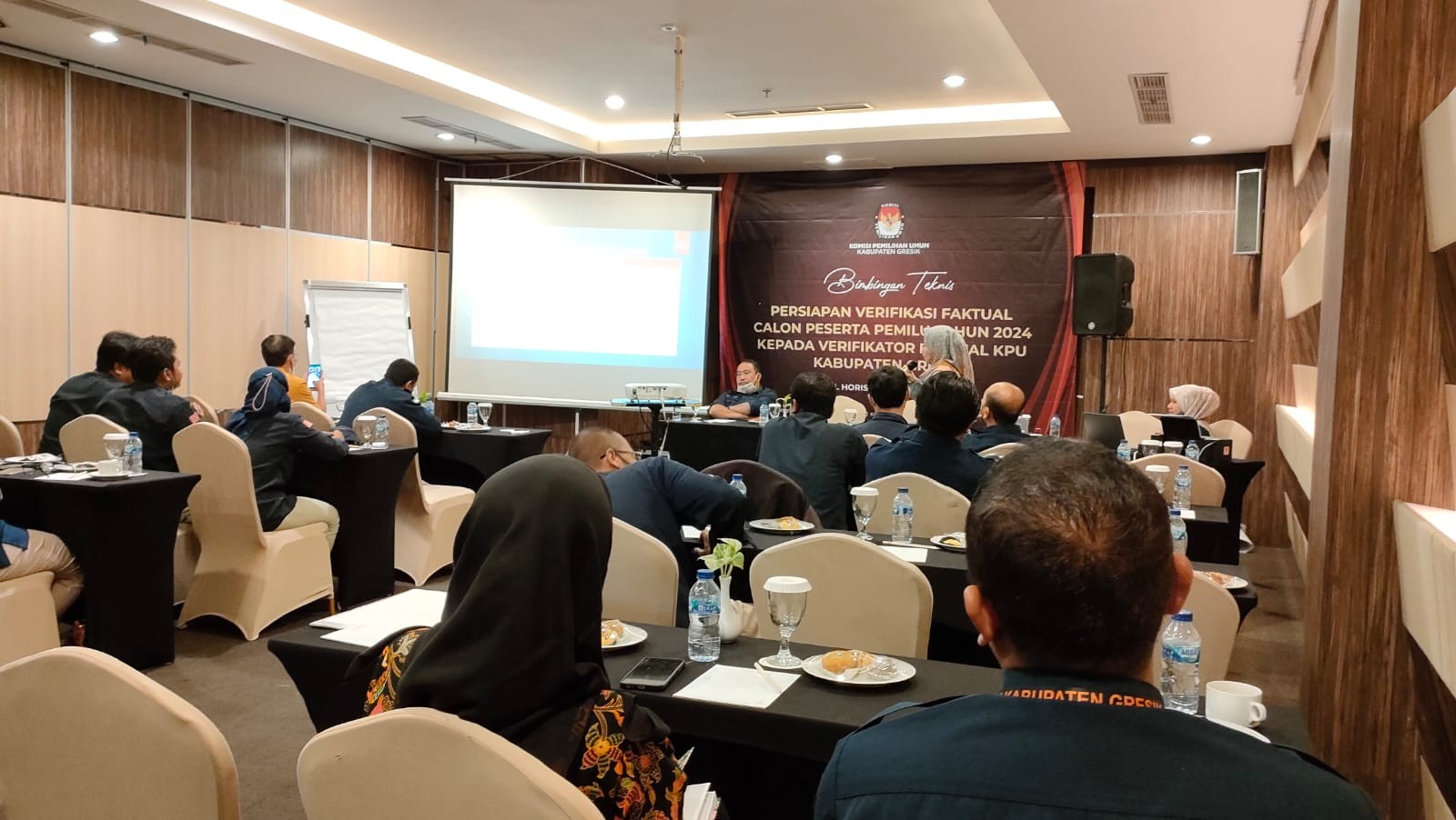 KPU Kabupaten Gresik laksanakan Bimbingan Teknis (BIMTEK) Persiapan Verifikasi Faktual Calon Peserta Pemilu Tahun 2024 kepada Verifikator KPU Kabupaten Gresik. Bertempat di Hotel Horison GKB, Jl. Kalimantan No. 12A, Wonorejo, Yosowilangun, Gresik. Kegiatan dimulai pukul 10.00 WIB – selesai. Tahapan Verifikasi Faktual tingkat Kabupaten/Kota dimulai dua hari lagi, yakni Senin , 17 Oktober 2022. Perlu adanya pengaturan strategi serta mitigasi yang tersistematis dalam pelaksanaannya. Hal ini disampaikan oleh Ketua KPU Kabupaten Gresik Akhmad Roni dalam arahannya saat membuka kegiatan Bimtek. “Verifikator perlu dibekali secara tuntas dalam forum, sehingga paham secara detail hal – hal yang menyangkut Verifikasi Faktual ini. Kegiatan dilakukan untuk mengurangi adanya kekeliruan saat pelaksanaan, ” pungkasnya. Mengimbuhkan, Divisi Teknis Penyelenggaraan Elvita Yuliati selaku pemateri BIMTEK menyebutkan bahwa terdapat perbedaan dengan periode lalu. Data sampling Verifikasi Faktual juga disebut bersifat rahasia. “Dengan dilakukannya Verfak ini, maka saya menghimbau kepada verifikator untuk tidak membocorkan informasi apapun dan kepada siapapun. Hal ini mencegah adanya sabotase semasa verfak,” Tegas Elvita. Hadir mengikuti kegiatan ini dari KPU Kabupaten Gresik yakni Ketua KPU Gresik Akhmad Roni serta seluruh Anggota KPU Gresik, Elivita Yuliati, Makmun, Abd. Sidiq, Kholiyatul dan Sekretaris Ahmad Fahruddin beserta jajarannya. Turut menghadirkan pula Dispendukcapil Kabupaten Gresik Sunarto, dan Bakesabangpol Kabupaten Gresik Rahmania Azizah. (kpugresik/defa)