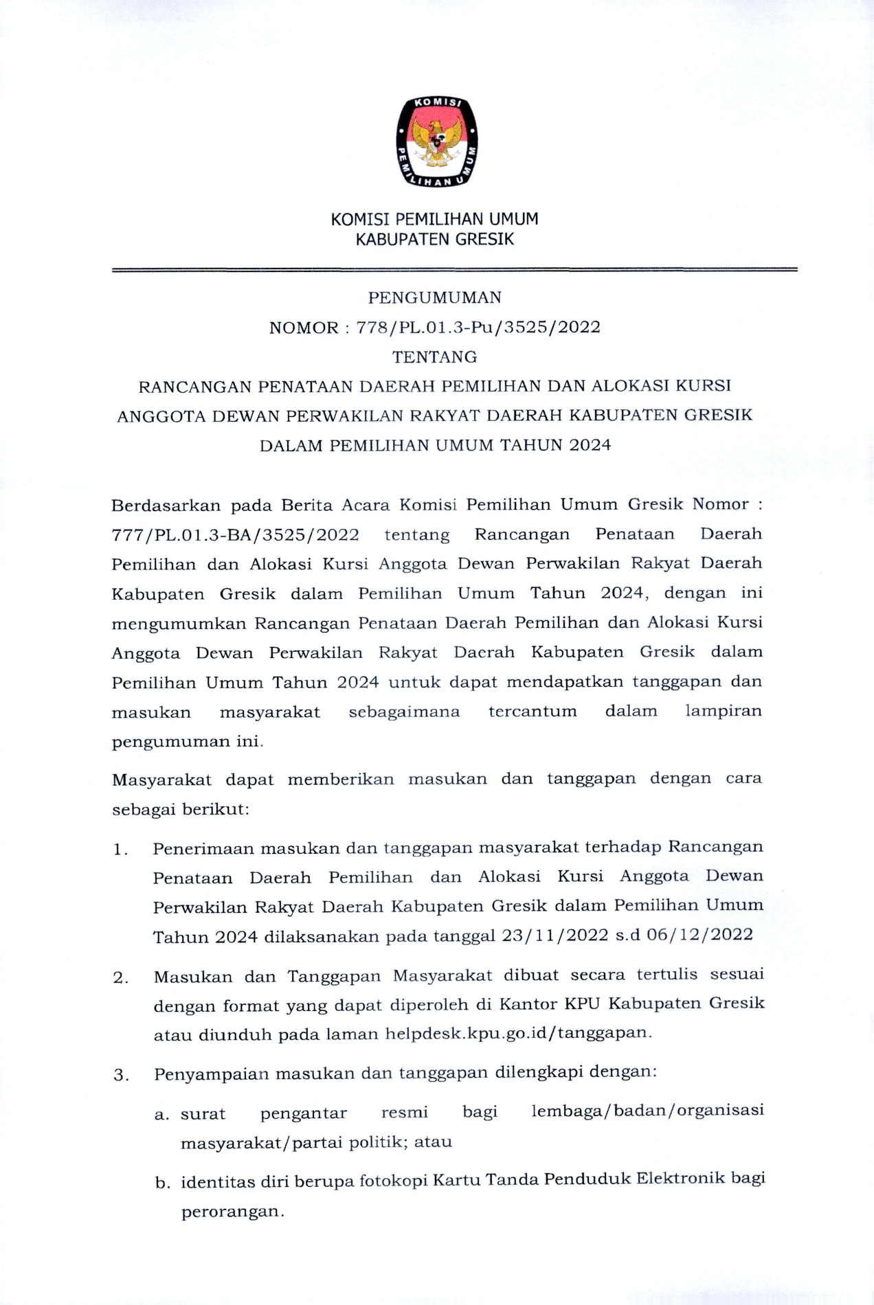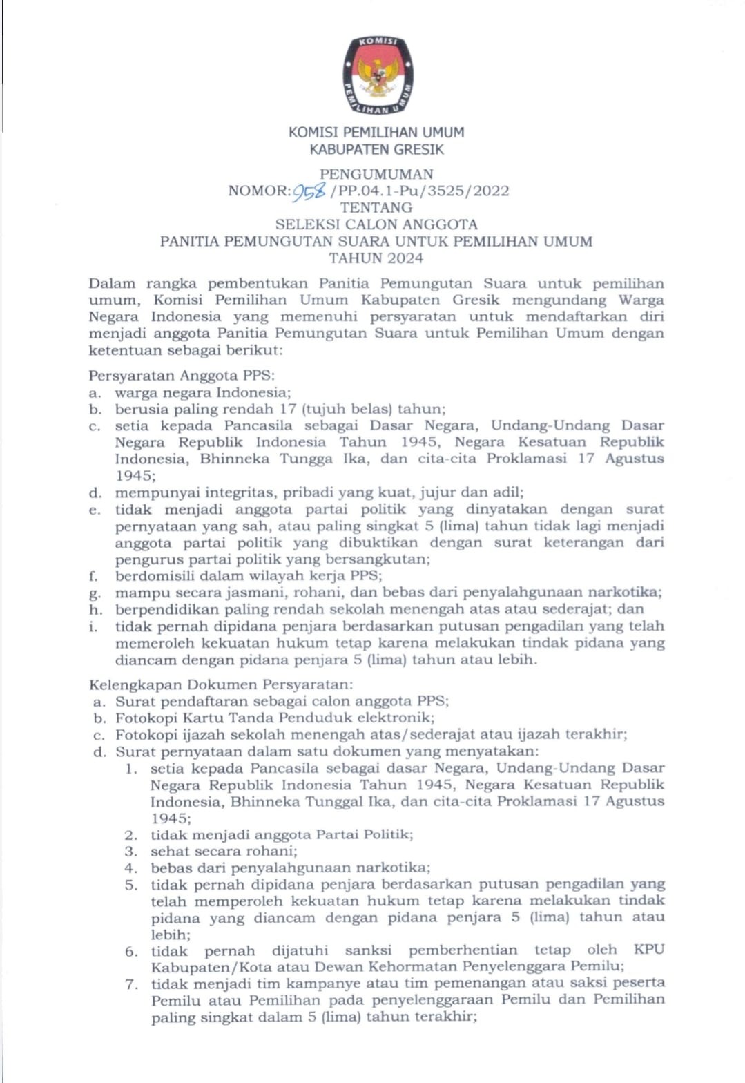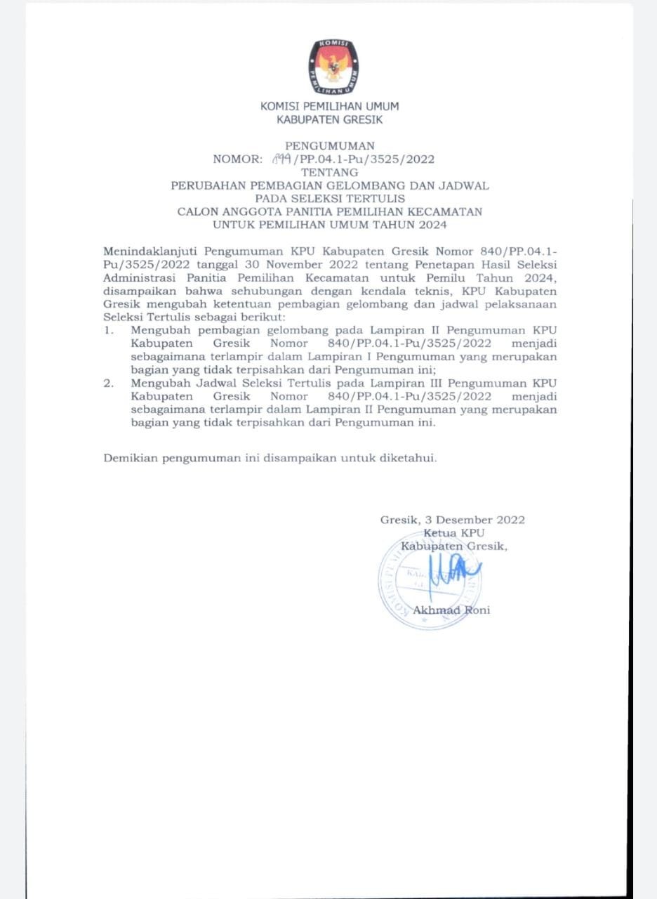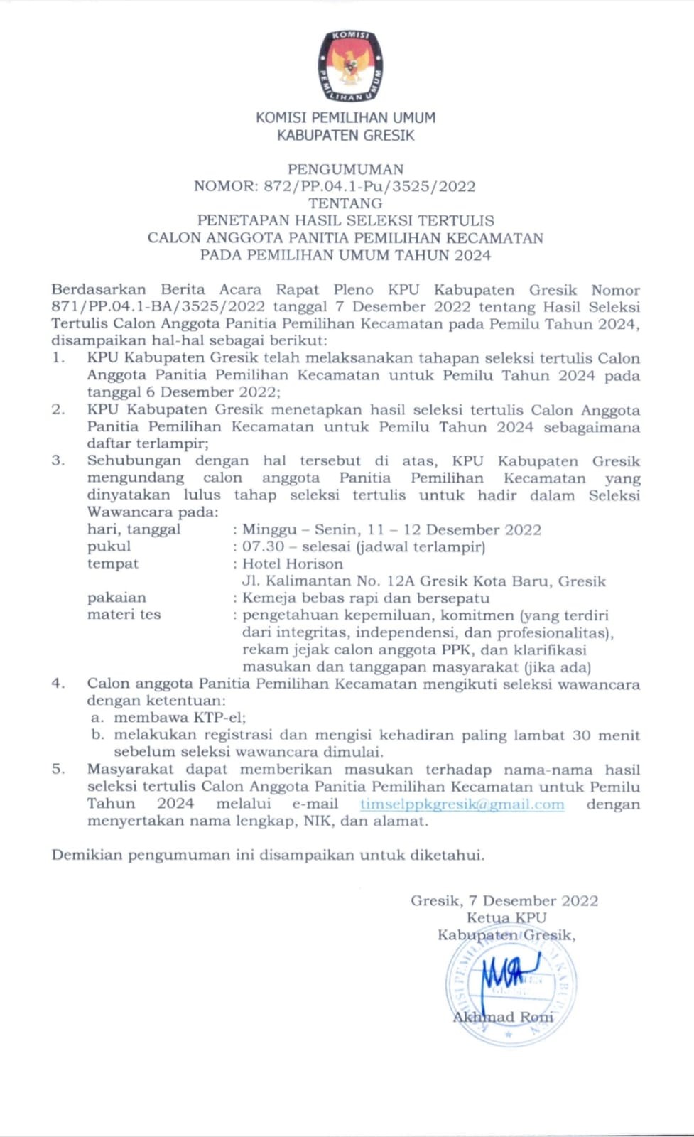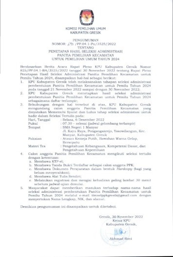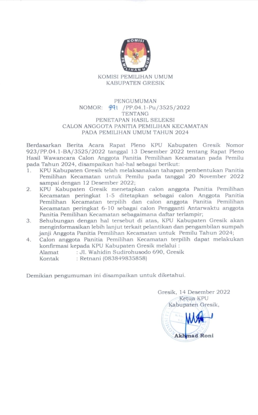 Berdasarkan Berita Acara Rapat Pleno KPU Kabupaten Gresik Nomor 825/PP.04.1-BA/3525/2022 tanggal 30 November 2022 tentang Rapat Pleno Penetapan Hasil Seleksi Administrasi Panitia Pemilihan Kecamatan untuk Pemilu Tahun 2024, KPU Kabupaten Gresik menetapkan hasil seleksi administrasi pembentukan Panitia Pemilihan Kecamatan untuk Pemilu Tahun 2024 sebagaimana daftar terlampir.