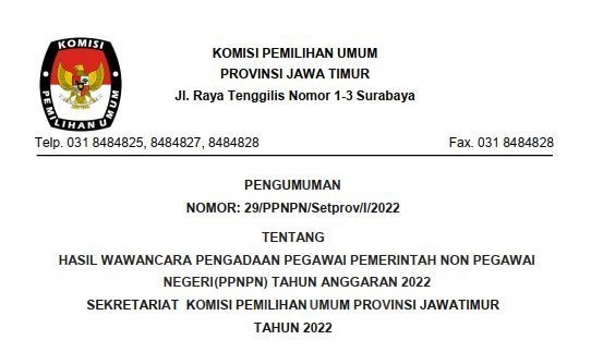 Berikut disampaikan Pengumuman Nomor: 29/PPNPN/Setprov/I/2022 Tentang Hasil Wawancara Pengadaan Pegawai Pemerintah Non Pegawai Negeri (Ppnpn) Tahun Anggaran 2022 Sekretariat Komisi Pemllihan Umum Provinsi Jawatimur Tahun 2022.