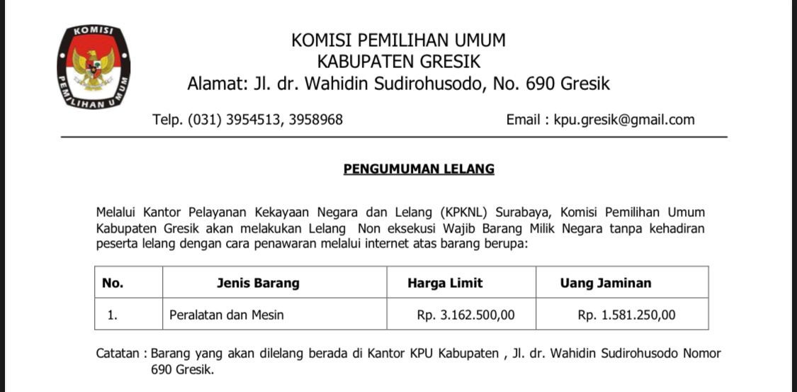 Melalui Kantor Pelayanan Kekayaan Negara dan Lelang (KPKN:) Surabay, , Komisi Pemilihan Umum Kabupaten Gresik akan melaksanakan penjualan lelang Barang Milik Negara dengan rincian lelang sebagai berikut Unduh.
