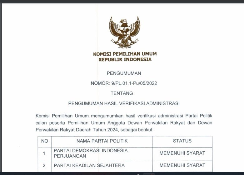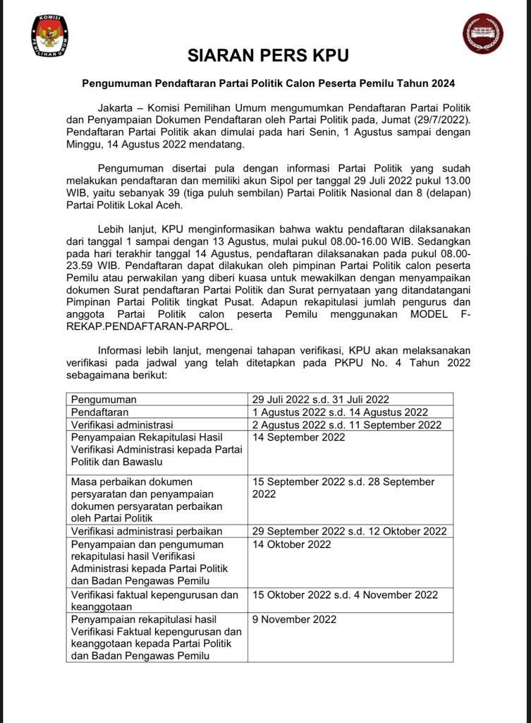 Komisi Pemilihan Umum Republik Indonesia mengumumkan Pendaftaran Partai Politik dan Penyampaian Dokumen Pendaftaran oleh Partai Politik pada hari Jum'at (29/7/2022). Pendaftaran Partai Politik akan dimulai tanggal 1 - 14 Agustus 2022 . rilis lengkapnya unduh disini