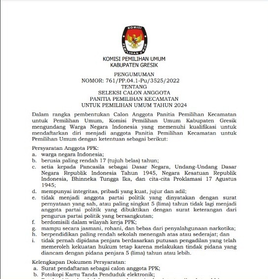 Komisi Pemilihan Umum Kabupaten Gresik mengumumkan Pengumuman Seleksi Calon Anggota Panitia Pemilihan Kecamatan Untuk Pemilu Tahun 2024 Nomor: 761/PP.04.1-Pu/3525/2022, rilis lengkapnya unduh disini