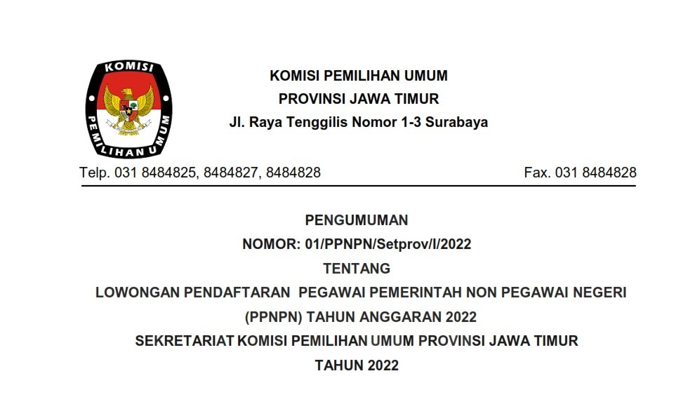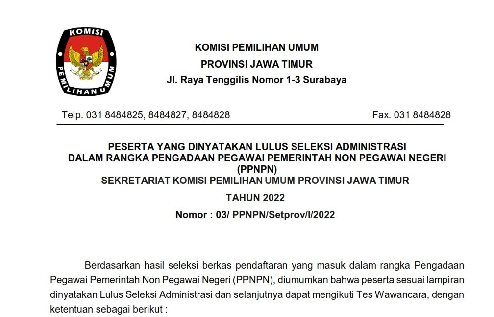 Berikut disampaikan pengumuman Nomor : 03/ PPNPN/Setprov/I/2022 tentang PESERTA YANG DINYATAKAN LULUS SELEKSI ADMINISTRASI DALAM RANGKA PENGADAAN PEGAWAI PEMERINTAH NON PEGAWAI NEGERI (PPNPN) SEKRETARIAT KOMISI PEMlLIHAN UMUM PROVINSI JAWA TIMUR TAHUN 2022.