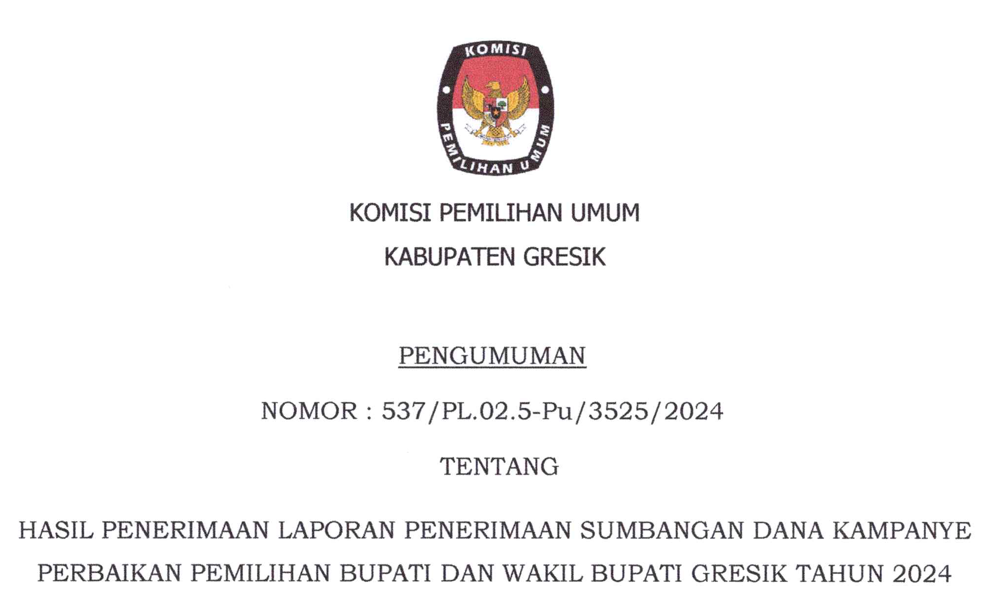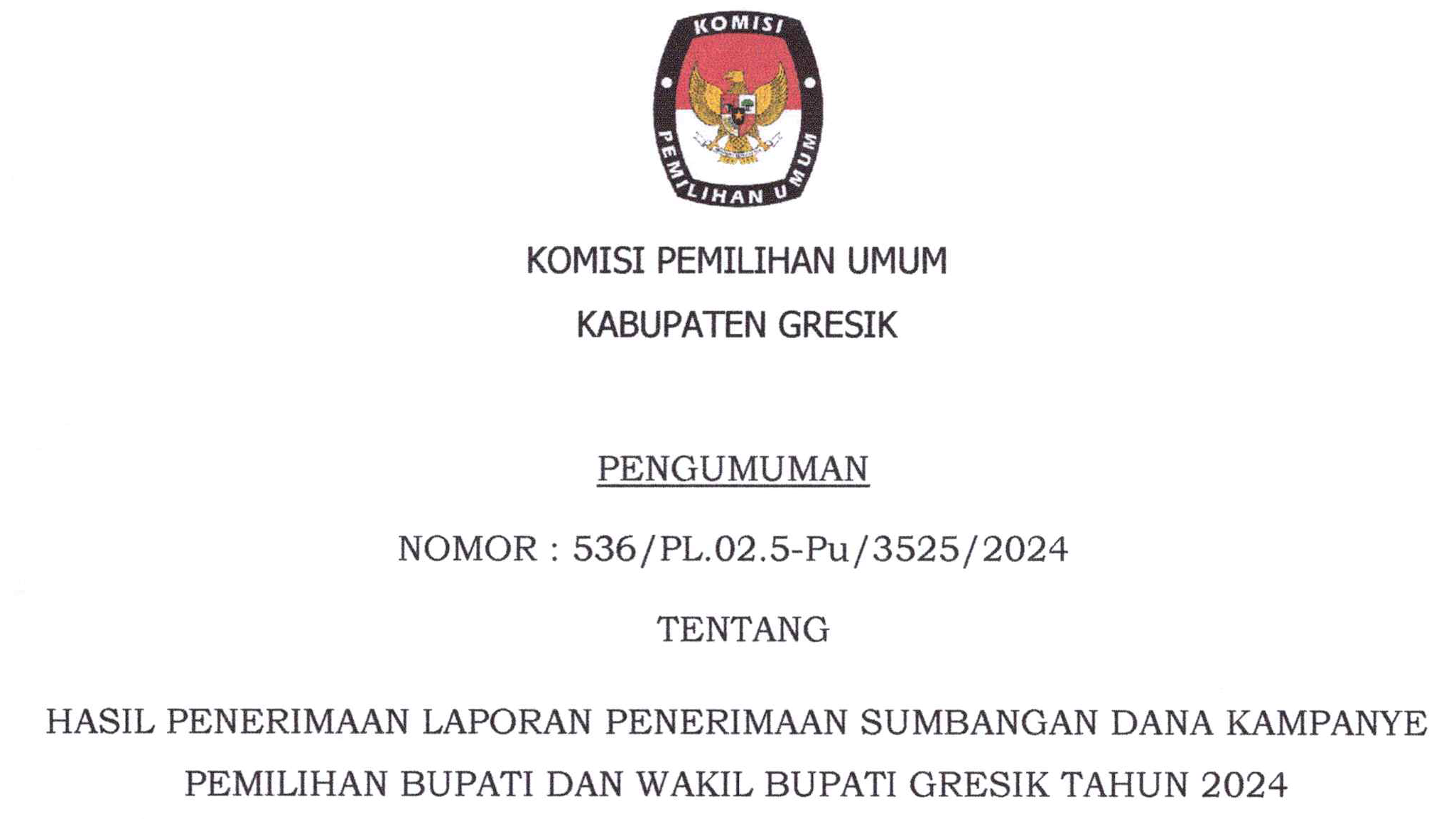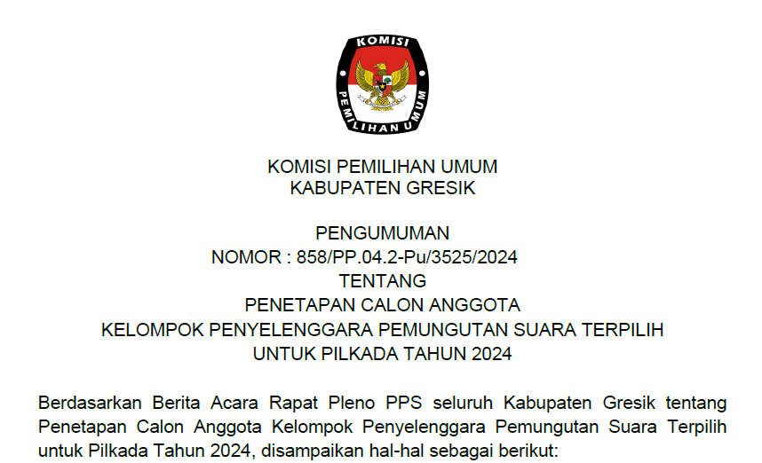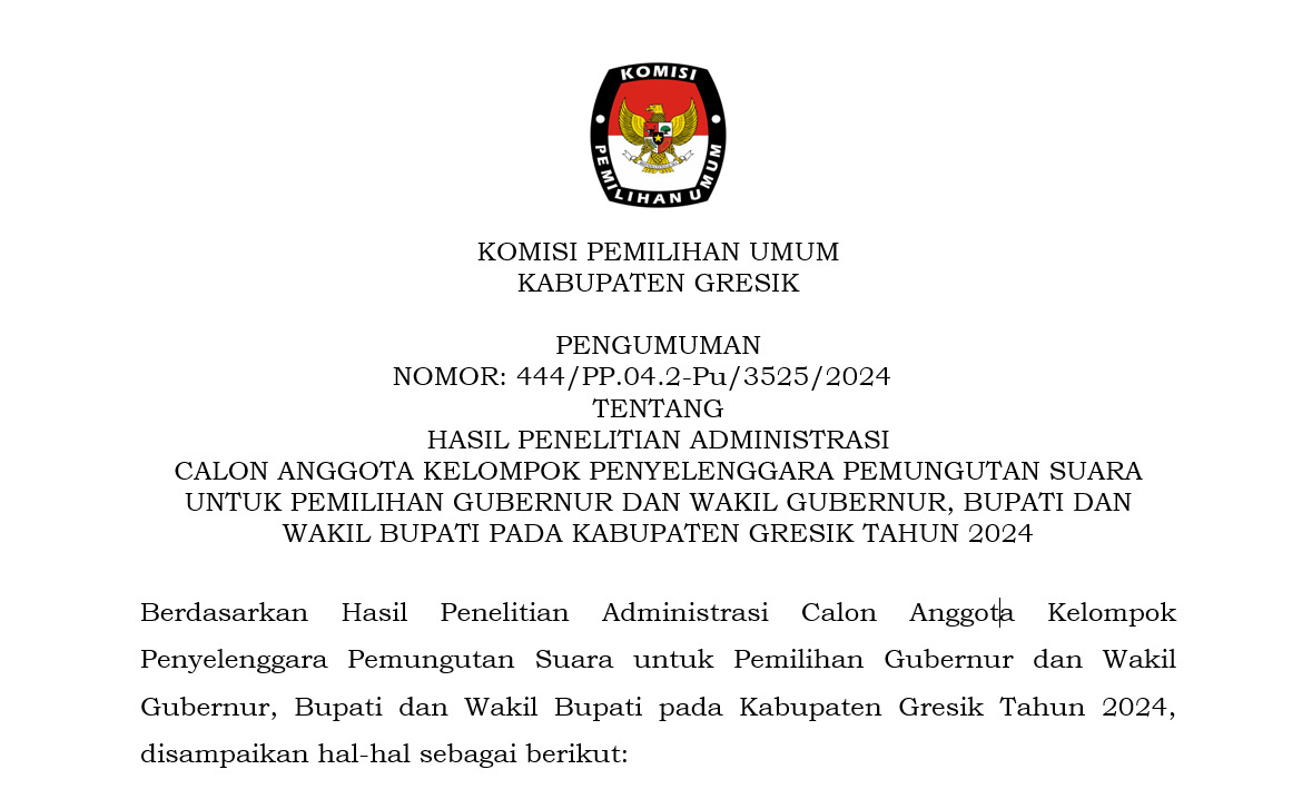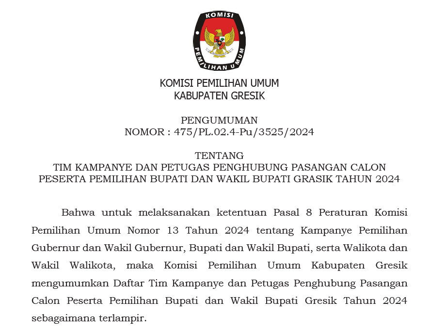 Bahwa untuk melaksanakan ketentuan Pasal 8 Peraturan Komisi Pemilihan Umum Nomor 13 Tahun 2024 tentang Kampanye Pemilihan Gubernur dan Wakil Gubernur, Bupati dan Wakil Bupati, serta Walikota dan Wakil Walikota, maka Komisi Pemilihan Umum Kabupaten Gresik mengumumkan Daftar Tim Kampanye dan Petugas Penghubung Pasangan Calon Peserta Pemilihan Bupati dan Wakil Bupati Gresik Tahun 2024 sebagaimana terlampir.