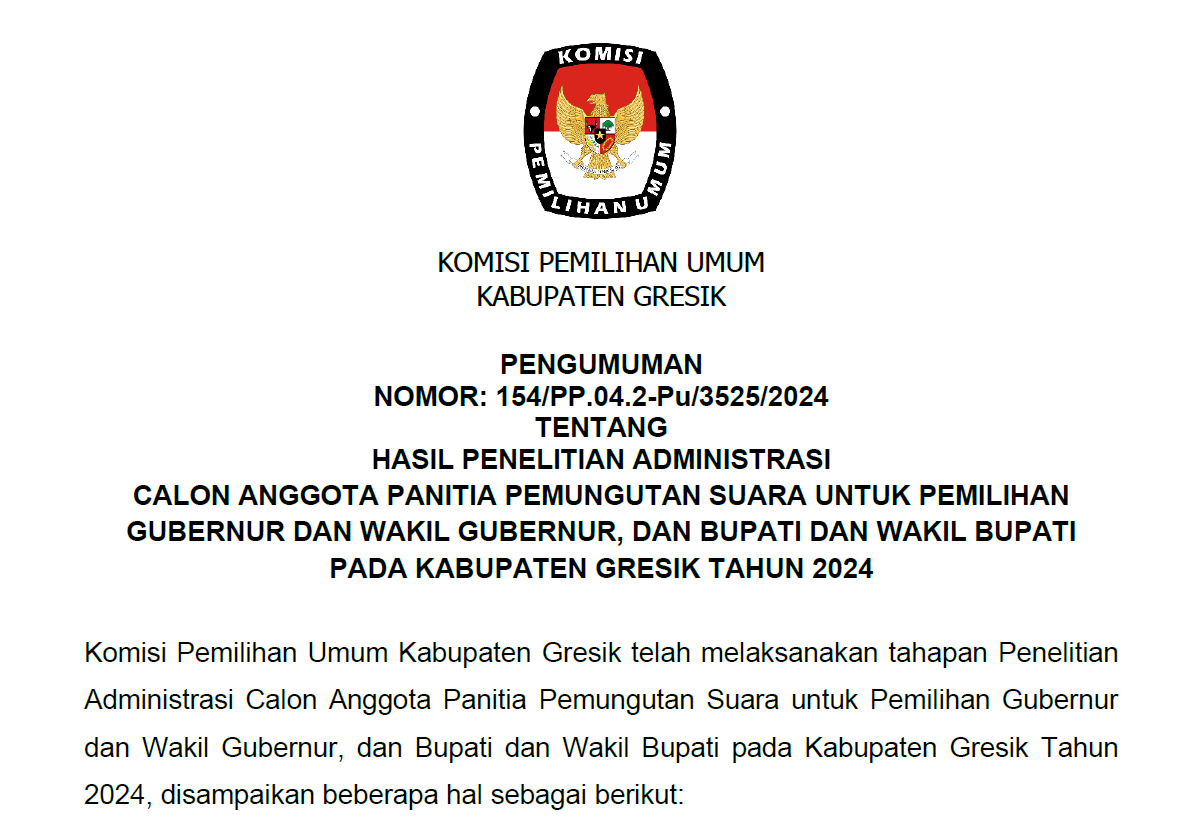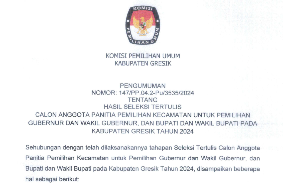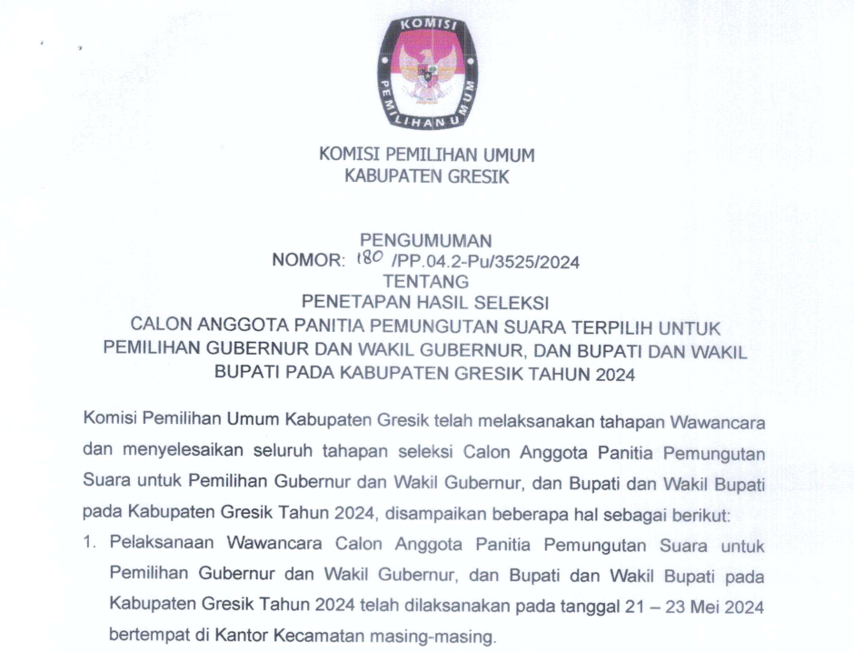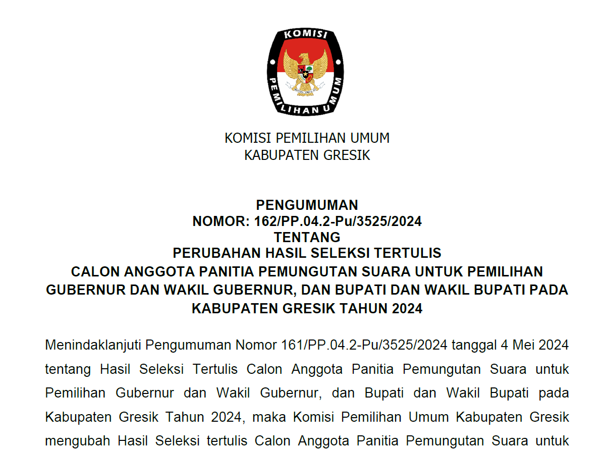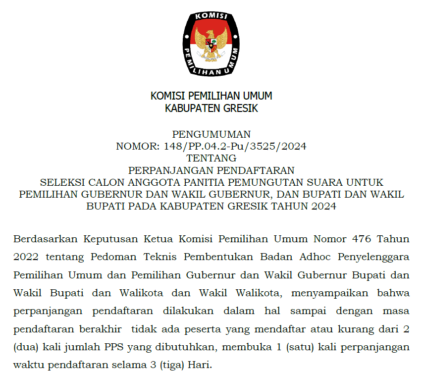 Sehubungan dengan hal tersebut, KPU Kabupaten Gresik, membuka perpanjangan waktu pendaftaran seleksi calon anggota PPS sejak tanggal 9 Mei 2024 sampai dengan tanggal 11 Mei 2024 pada Kelurahan/Desa sebagaimana terlampir, selengkapnya unduh disini