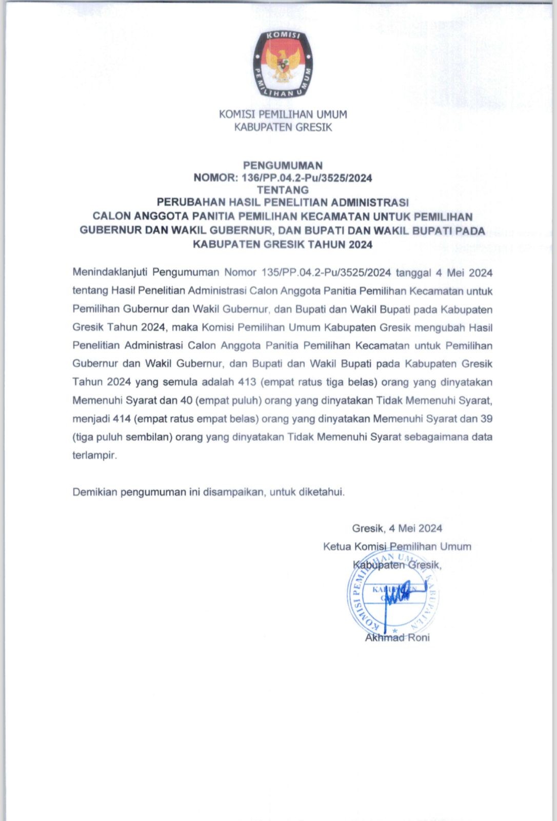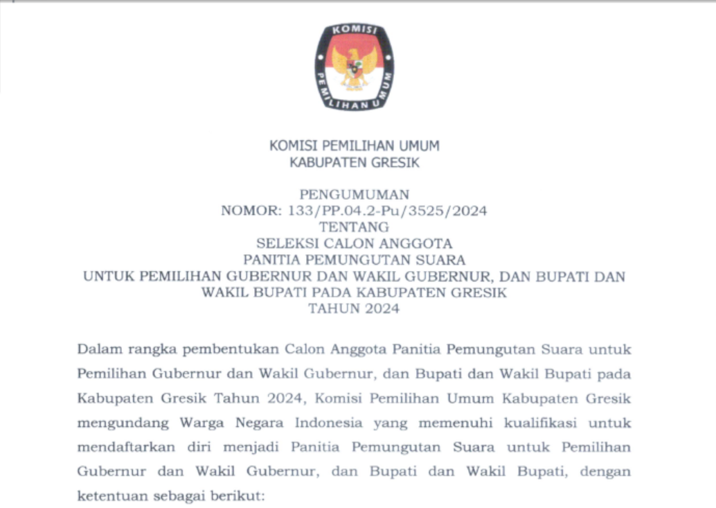 Pendaftaran Panitia Pemilihan Kecamatan (PPK) untuk Pemilihan Bupati dan Wakil serta Gubernur dan Wakil tahun 2024 di Kabupaten Gresik memasuki hari terakhir.
