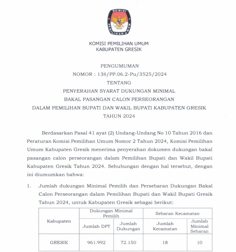 Hal ini, sebagaimana tertera dalam jadwal pendaftaran yang dirilis KPU Kabupaten Gresik, yaitu tanggal 23 s/d 29 April 2024.