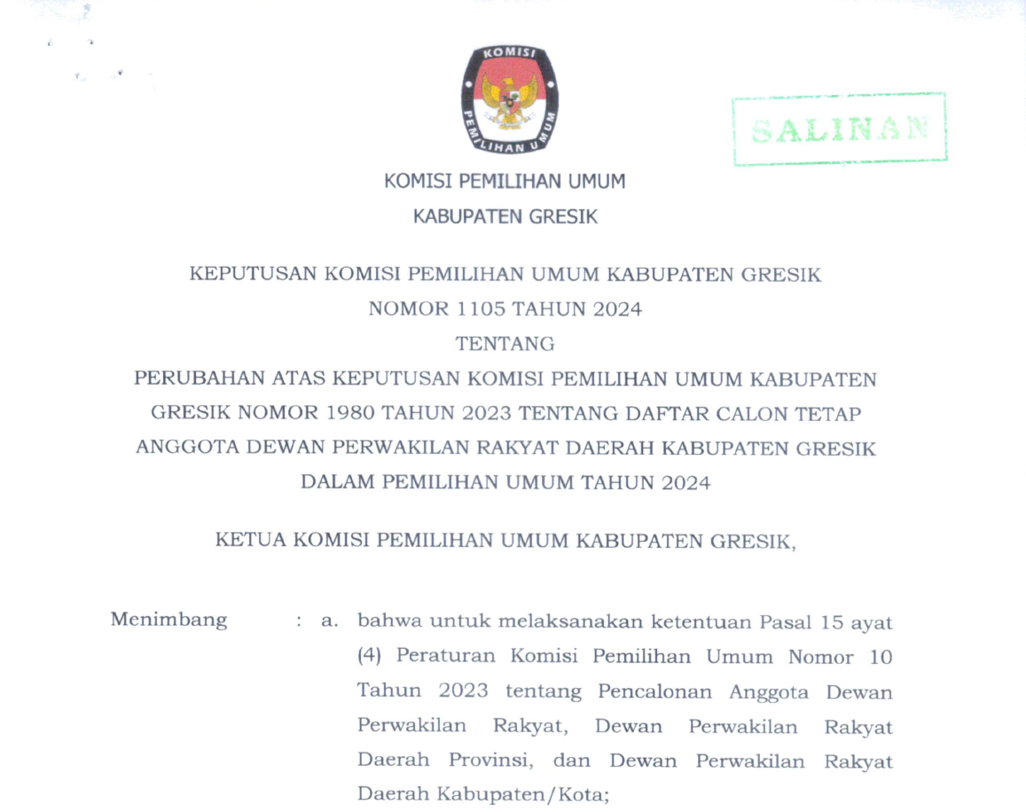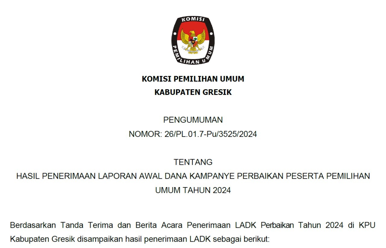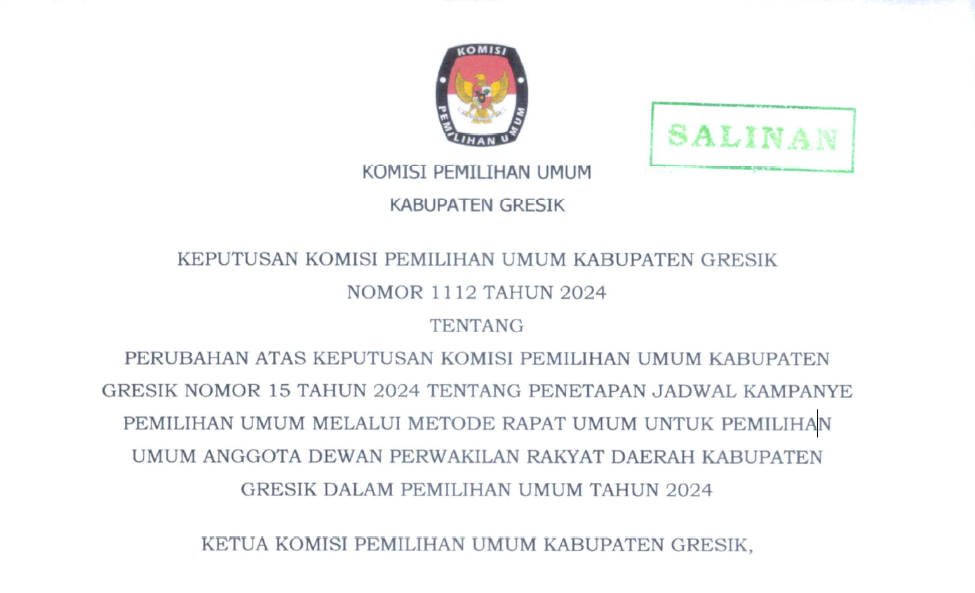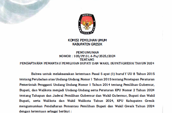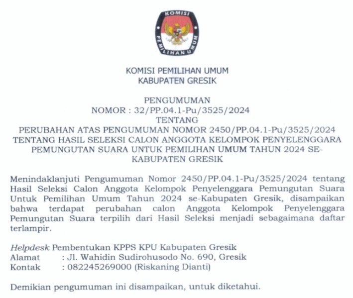 Menindaklanjuti Pengumuman Nomor 2450/PP.04.1-Pu/3525/2024 tentang Hasil Seleksi Calon Anggota Kelompok Penyelenggara Pemungutan Suara Untuk Pemilihan Umum Tahun 2024 se-Kabupaten Gresik, disampaikan bahwa terdapat perubahan calon Anggota Kelompok Penyelenggara Pemungutan Suara terpilih dari Hasil Seleksi menjadi sebagaimana terlampir. Selanjutnya klik disini