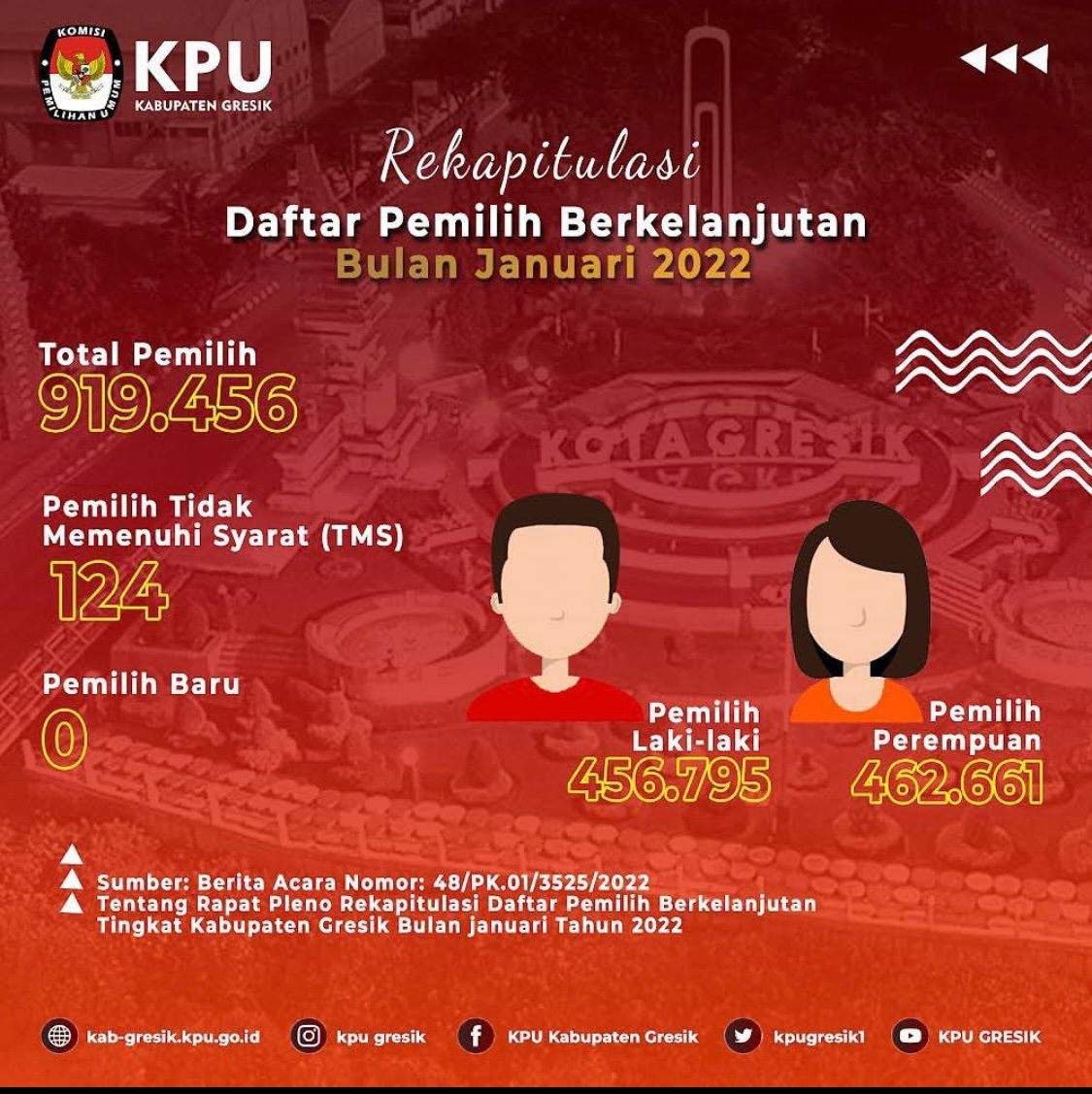Berikut disampaikan pengumuman Nomor: 48 /PK.01/3525/2022 tentang Daftar Pemilih Berkelanjutan Kabupaten Gresik Bulan Januari Tahun 2022, berikut kami sampaikan Daftar Pemilih Berkelanjutan Bulan Januari 2022 sebagimana terlampir.